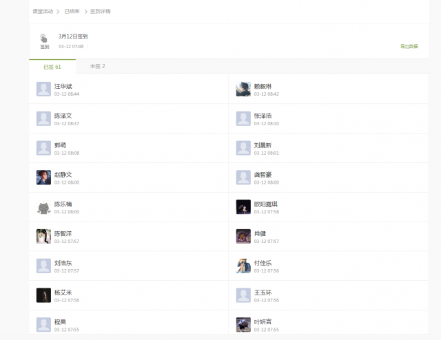 但是,这种线上教学方式也存在着一些问题,其中比较突出的是对于学生的监督问题。由于没法看到学生们在家里上课的情况,监督是个难题,每次签到总有个别同学没签到,或者在规定时间内不签到要求老师放宽签到时间,同时,有的学生可能存在“仅签到,而不学”的情况。另外,有个别同学家住农村或者边远山区,有时候网络不稳定,导致签到不及时或者作业提交不上。针对这些情况,我们课程组老师之间也在加强沟通和交流,思考能够改善这个问题的方法或措施,如在微信群催同学签到,让班干部或者关系好的同学相互提醒签到等等,后续可能还会做一些新的探索。为家住农村或者边远山区的学生延长签到时间和提交作业的时间。