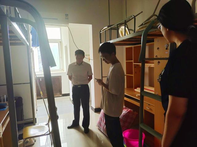 邹春发书记、李大晖副书记、吴佩芹老师一起走访新生宿舍。在宿舍内,邹春发书记与新生们交流融洽,期间,他亲切询问新生们的到校具体情况,对新同学来到经院大家庭表示热烈欢迎。他还向新生们了解了宿舍寝具订购和相关服务情况,并且叮嘱同学们遇到寝室设施问题及时上报,学院会尽快帮助解决。同时他建议同学们在闲余时间可以多多熟悉校园,在迎新点处多多与同学交流,减轻初到校园的陌生感和焦虑感。并且提醒同学们树立安全意识,外出记得锁门,保管好贵重物品。最后,邹春发书记在离开迎新接待点前,对迎新接待者们的辛勤工作表示感谢,同时鼓励大家以饱满的热情继续做好明后两天的迎新接待工作,为经院新生留下美好的入学印象。