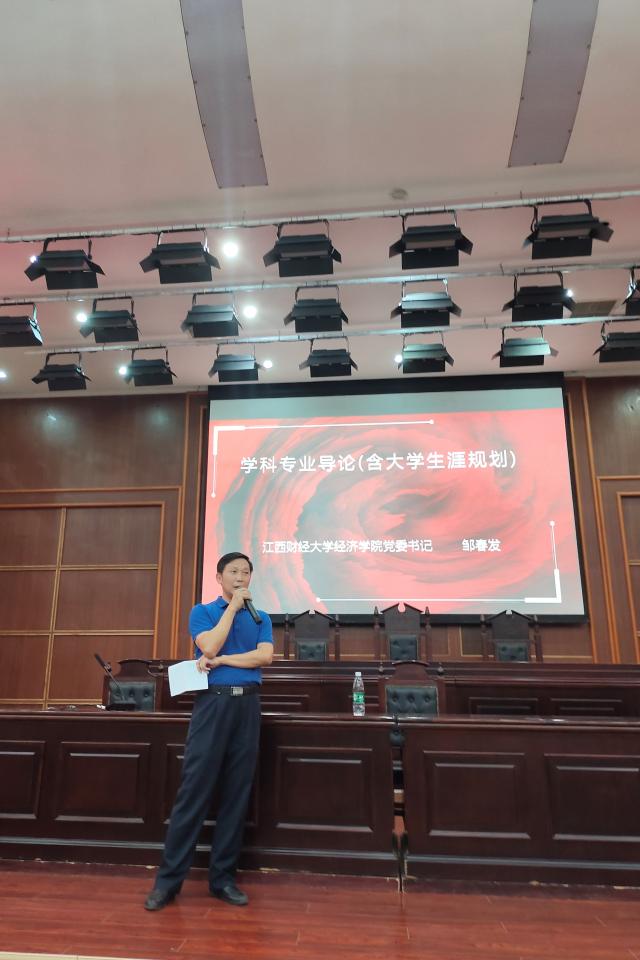9月15日晚,91短视频 党委书记邹春发于麦庐园校区三教报告厅为新生讲授学科导论课程。