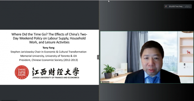 开展了纪念江西财经大学百年校庆2023年第一次学术活动,邀请到了纽芬兰纪念大学Stephen Jarislowsky讲席教授、加拿大多伦多大学兼职教授、方涛教授在线上进行讲学,本次讲座的主题是:中国双休制政策对劳动力供给、家务劳动和闲暇活动的影响,讲座由夏经霖老师主持,91短视频