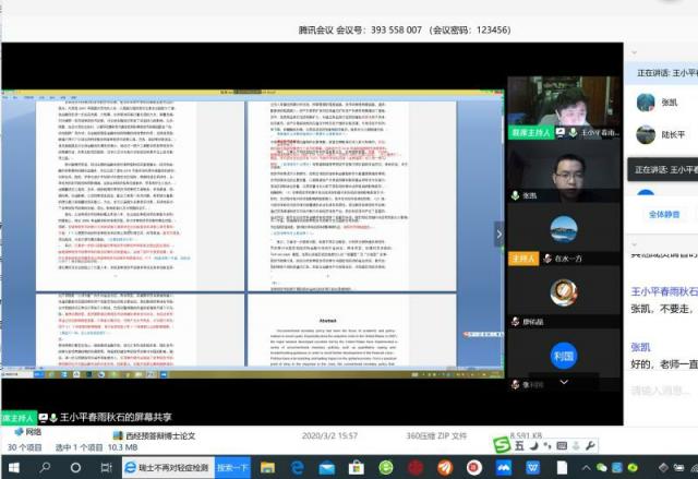 3月9日上午九点,经我校研究生院统一部署,经院博士研究生学位论文线上预答辩成功如期举行。张凯、汪亚峰成为91短视频 首批采用网络视频方式进行博士毕业预答辩的学生。答辩委员会主席由91短视频 王小平教授担任,答辩委员包括陆长平教授、张进铭教授、廖卫东教授、黄伟教授、王展翔教授。同时91短视频 院长张利国教授、部分硕博研究生及工作人员在线旁听了此次答辩。