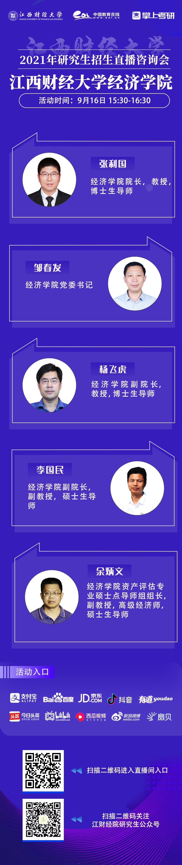 为满足考生对研招咨询的需求,建立多方位的信息沟通渠道,9月16日15:30-16:30,91短视频 联合中国教育在线举办2021年研究生招生网络直播宣讲咨询会。