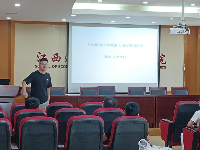 在718会议室顺利举行“双周学术研讨会”。学院青年教师林涛博士在此次研讨会中汇报了其最新研究成果《大规模调水对城市土地市场的影响》。