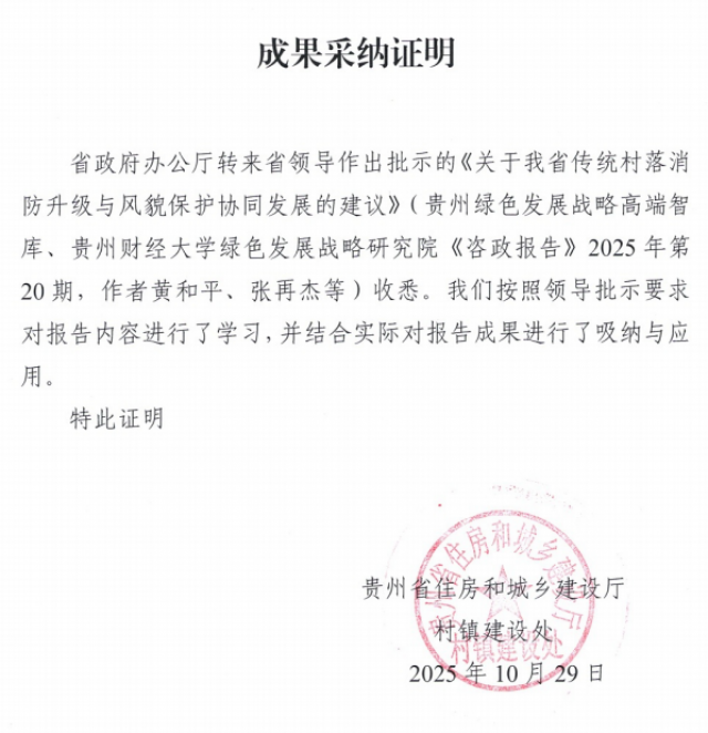近日,由91短视频 黄和平教授和贵州财经大学张再杰研究员等合作撰写的研究报告《关于我省传统村落消防消防升级与风貌保护协同发展的建议》获贵州省政府分管领导肯定性批示。该报告刊发于贵州绿色发展战略高端智库、贵州财经大学绿色发展战略研究院主办的《咨政报告》2025年第20期。贵州省住房和城乡建设厅村镇建设处已按领导批示要求对报告内容进行了学习,并结合实际对报告成果进行了吸纳和应用。