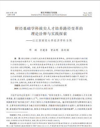 近日,由邓辉、万建香、曾永明、张利国合作的教学研究成果《财经基础学科拔尖人才培养路径变革的理论诠释与实践探索——以江西财经大学经济学科为例》在新文科研究领域有影响力的期刊《新文科理论与实践》发表(2025年第4期),文章系统阐释了我校以经济学科为代表的财经基础学科拔尖人才培养模式变革的创新探索。