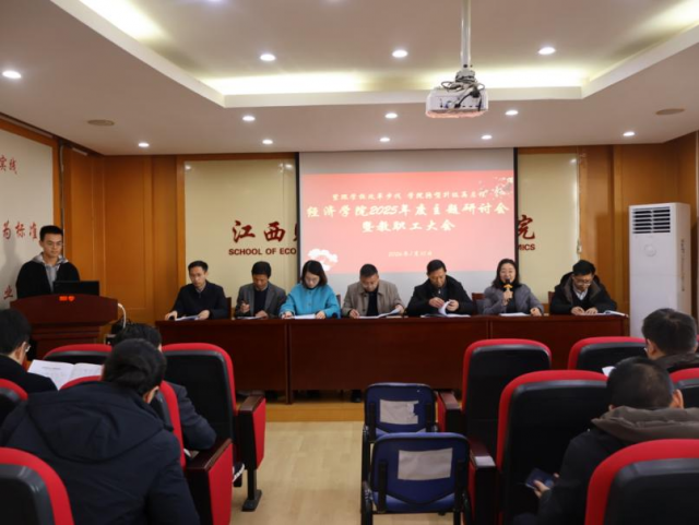 各系、科室负责人分别汇报了2025年度工作完成情况及2026年工作计划。国民经济管理系、国际经济系、政治经济学系、资源环境经济学系,以及党政办公室、学生工作办公室、团委、科研与研究生管理办公室、教务办公室依次进行汇报。会上还开展了“服务四优”评选及年度先进系、先进科室推选工作。